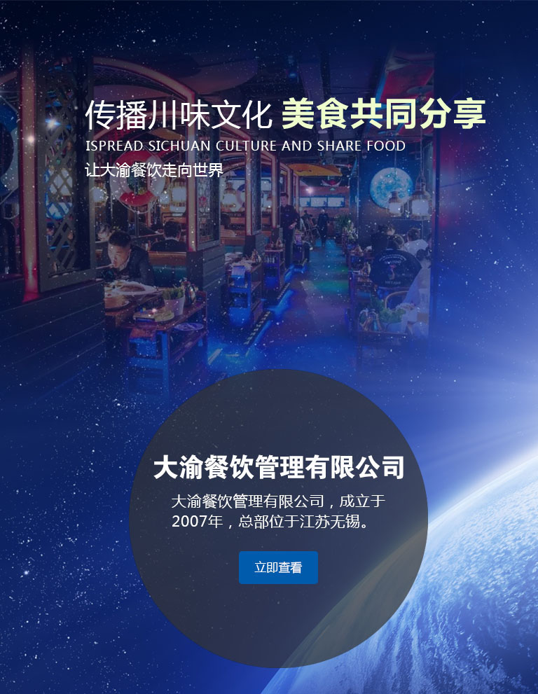 大渝餐飲管理有限公司,創建于2007年,總部位于江蘇無錫,是由創始人杜哥聯合全國數名高級川味技術研究專家和連鎖企業管理專家共同打造的連鎖餐飲企業。
