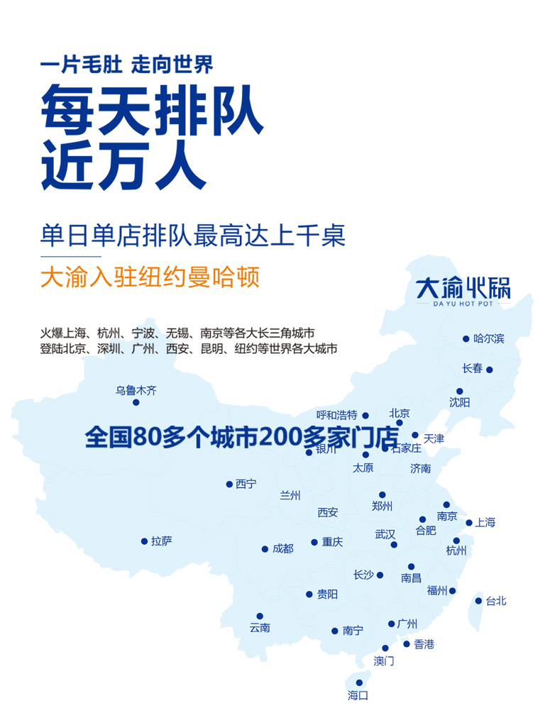 大渝餐飲以長三角地區為中心向全國輻射性發展,現在在全國已成立200多家直營店和加盟店。大渝火鍋2018正式進軍美國市場,
